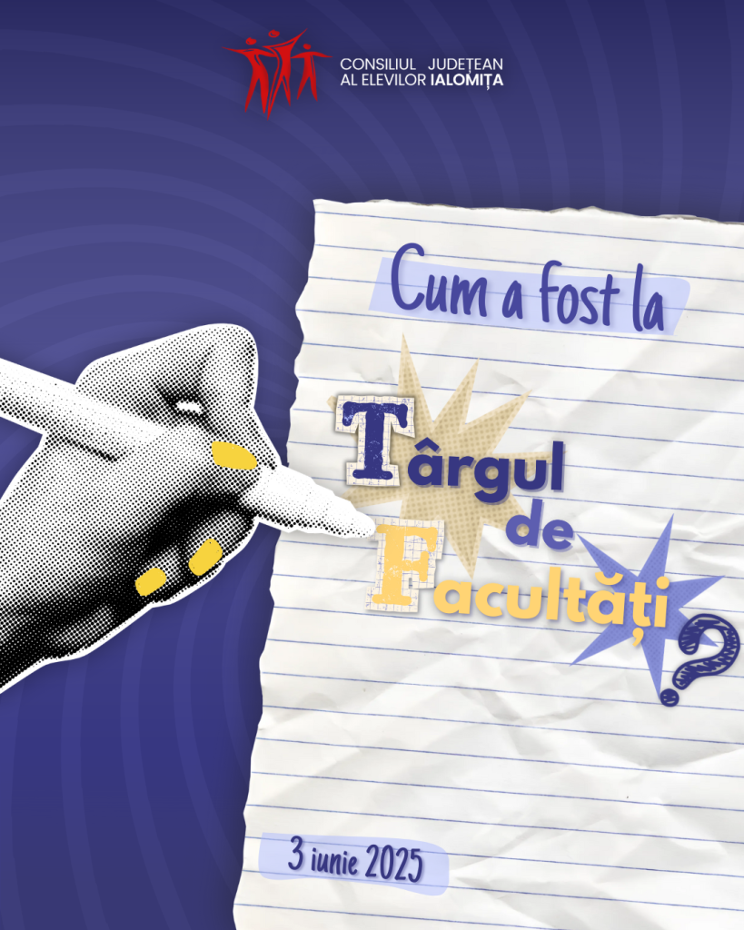 🫡 În calitate de elevi poziționați în fața faptului de a ne alege un viitor academic pliat pe propria personalitate, înconjurați fiind de tumultul întrebărilor cu privire la acesta, echipa Consiliului Județean al Elevilor Ialomița a venit cu ideea de înființare a unui târg de facultăți. Zis și făcut! Colaborând cu Universitatea Politehnica din București, Universitatea Petrol și Gaze Ploiești, alături de Universitatea din București, am reușit să atenuăm din greutatea alegerii unei cariere.